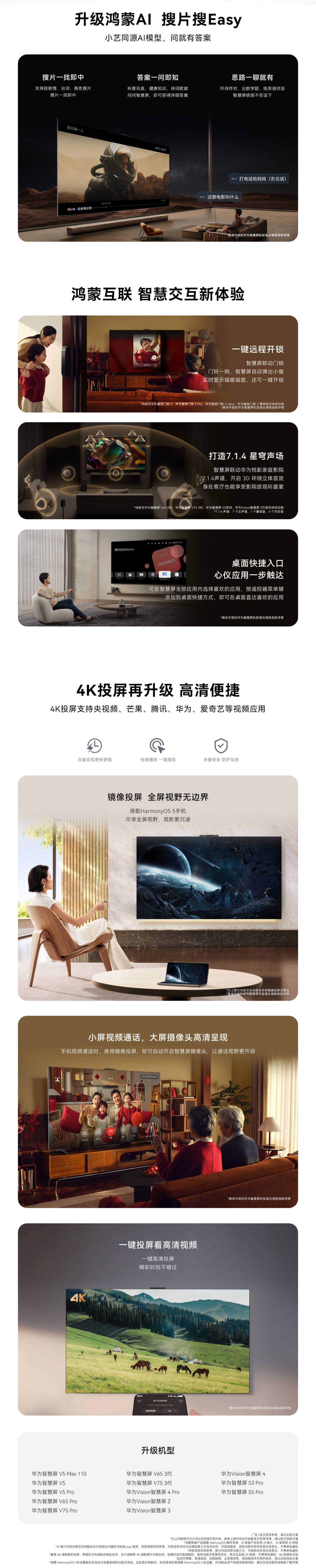 4K 投屏升级:4K 投屏支持央视频、芒果、腾讯、华为、爱奇艺等应用;图库镜像投屏无边框;支持手机视频通话镜像投屏;支持一键高清投屏