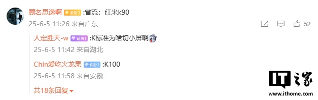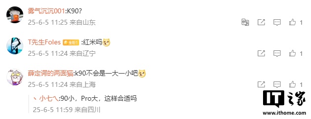目前尚不清楚这款新机的具体型号,不过该爆料的评论区有网友推测为小米 REDMI K90 系列。