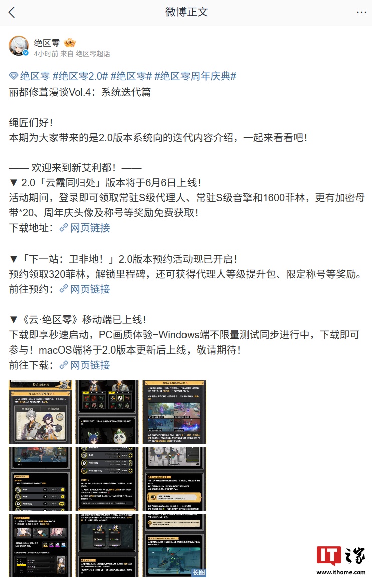 IT之家 6 月 5 日消息,米哈游《绝区零》游戏官方微博今日发文介绍了 2.0 版本系统向的迭代内容,并表示《云・绝区零》移动端已上线、Windows 端不限量测试同步进行中、macOS 端将于 2.0 版本更新后上线。