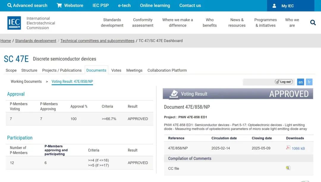 IT之家 6 月 5 日消息,成都辰显光电有限公司在国际电工委员会(IEC)牵头制定的国际标准提案《半导体器件第 5-17 部分:光电子器件发光二极管微型发光二极管阵列器件光电参数测试方法》通过了新工作项目提案(NP)投票。