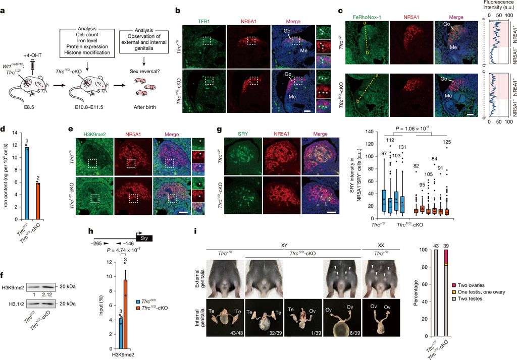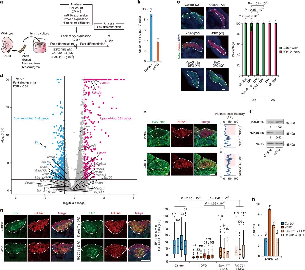 研究聚焦于哺乳动物中决定雄性性别的关键基因 Sry,试图揭示细胞内铁水平是否会干扰其功能。实验结果令人震惊:在孕期小鼠的低铁饮食组中,部分携带 XY 染色体的胚胎竟然发育出了卵巢,呈现出雄性向雌性的性别逆转。