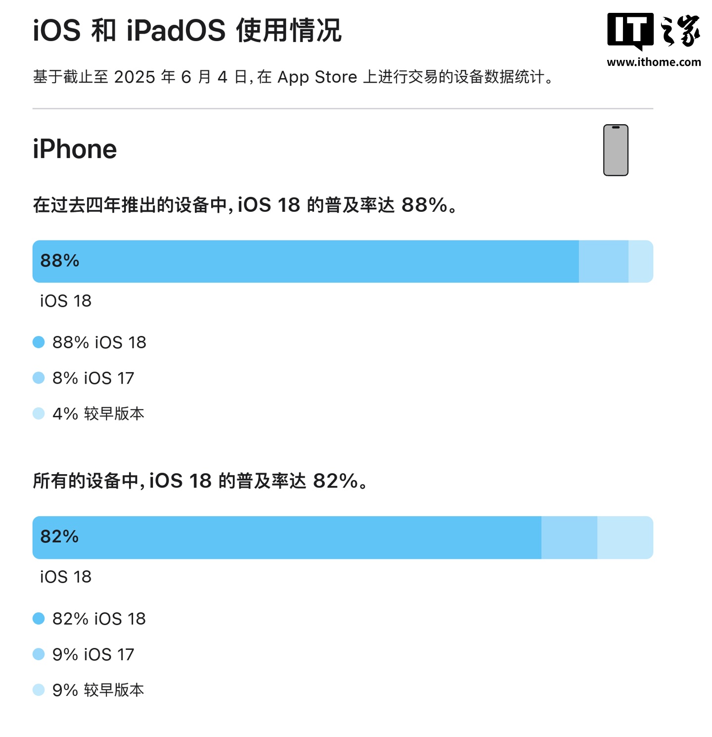 IT之家 6 月 6 日消息,根据苹果开发者官网公布的最新数据,基于截至 2025 年 6 月 4 日,在 App Store 上进行交易的设备数据统计,在过去四年推出的设备中,iOS 18 的普及率达 88%;在所有设备中,普及率达 82%。