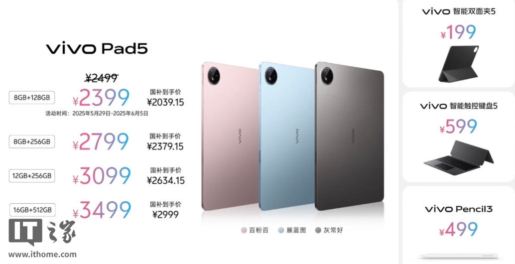 vivo Pad5 可选三款配色,存储 8GB + 128GB 起步,首发价 2399 元起,国补后 2039.15 元起。IT之家附定价如下: