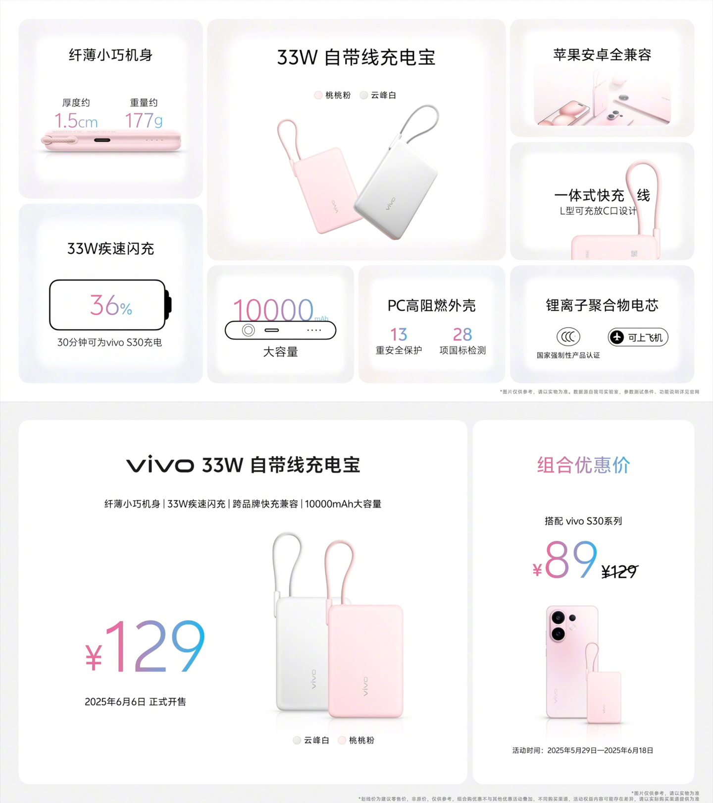 IT之家 6 月 6 日消息,vivo 33W 自带线充电宝今日正式开售,其容量为 10000mAh 并支持跨品牌快充,售价 129 元(IT之家注:券后 117 元,搭配 vivo S30 系列手机可享组合优惠价 89 元)。