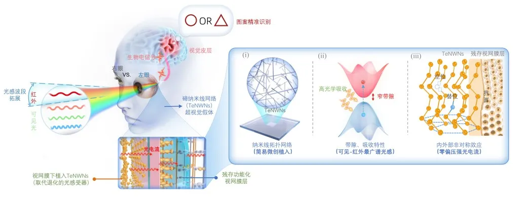 该团队开发出全球首款光谱覆盖范围极广(470-1550nm,从可见光延伸至近红外二区)的视觉假体,该假体无需依赖任何外部设备,即可使失明动物模型恢复可见光视觉能力,还能赋予动物感知红外光,甚至识别红外图案的“超视觉”功能,也就是在黑暗中也能看见事物。