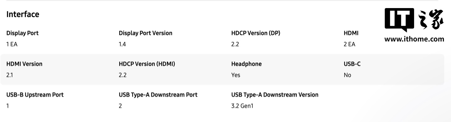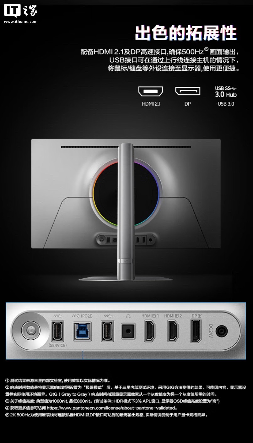 该机支架支持升降 / 倾斜 / 旋转,显示器背面带有 RGB 灯,I/O 方面提供 2 个 HDMI 2.1 接口、1 个 DP 1.4 接口、1 个 USB-A 3.2 Gen 1 接口(KVM)及对应的 USB-B 接口、1 个 USB-A(SERVICE)接口(具体是否能传输数据未知,海外官网显示应能传输数据,以具体实机为准)。