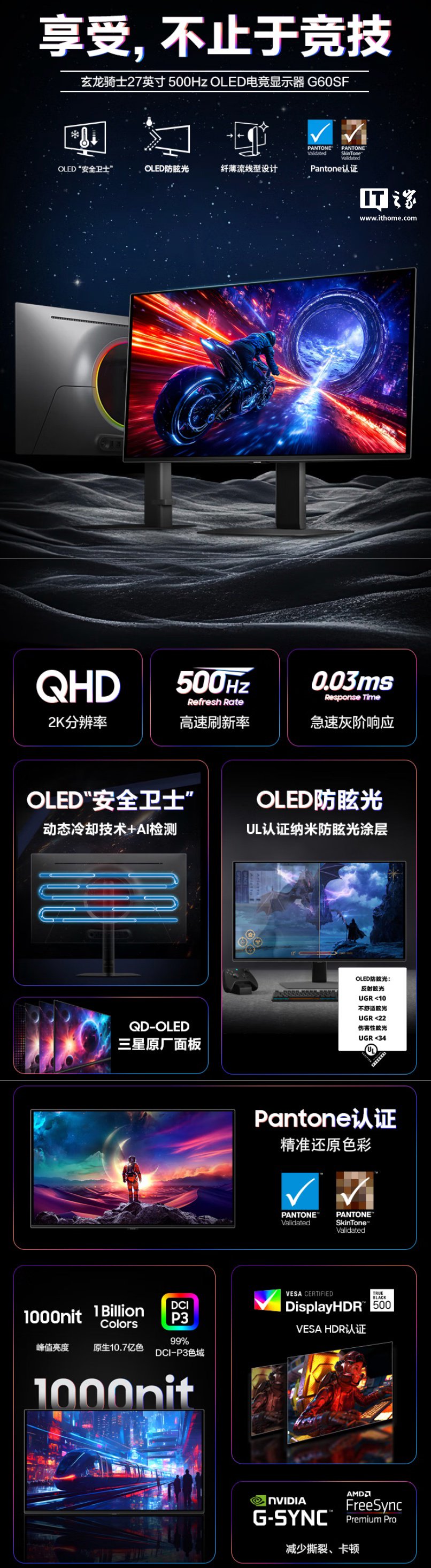 该机配备一块 2560x1440 分辨率 500Hz OLED 面板,拥有 0.03ms 的 GtG 响应时间、300 尼特全屏 SDR 亮度、1000 尼特峰值亮度,获得 VESA DisplayHDR True Black 500 认证。显示器支持原生 10-Bit 色彩,色域覆盖 99% DCI-P3,具备彩通 Pantone 色彩及肤色认证、TÜV 莱茵硬件防蓝光认证,支持 AMD FreeSynx Premium Pro。