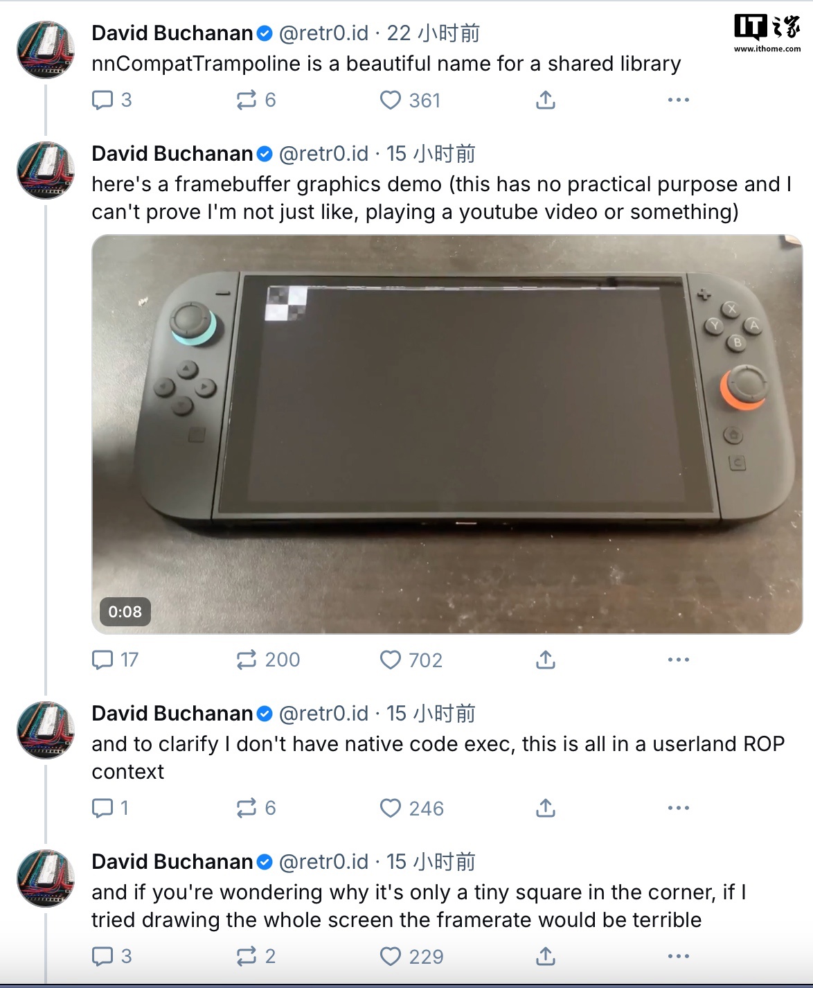 David Buchanan 在文中表示,他是利用了“用户区(userland)”的 ROP 漏洞,在 Switch 2 上成功运行了一个自定义帧缓冲区图形;但他利用的这个漏洞并不涉及原生代码执行,代码运行在内核之外,并没有完整的系统权限或直接访问硬件的能力。