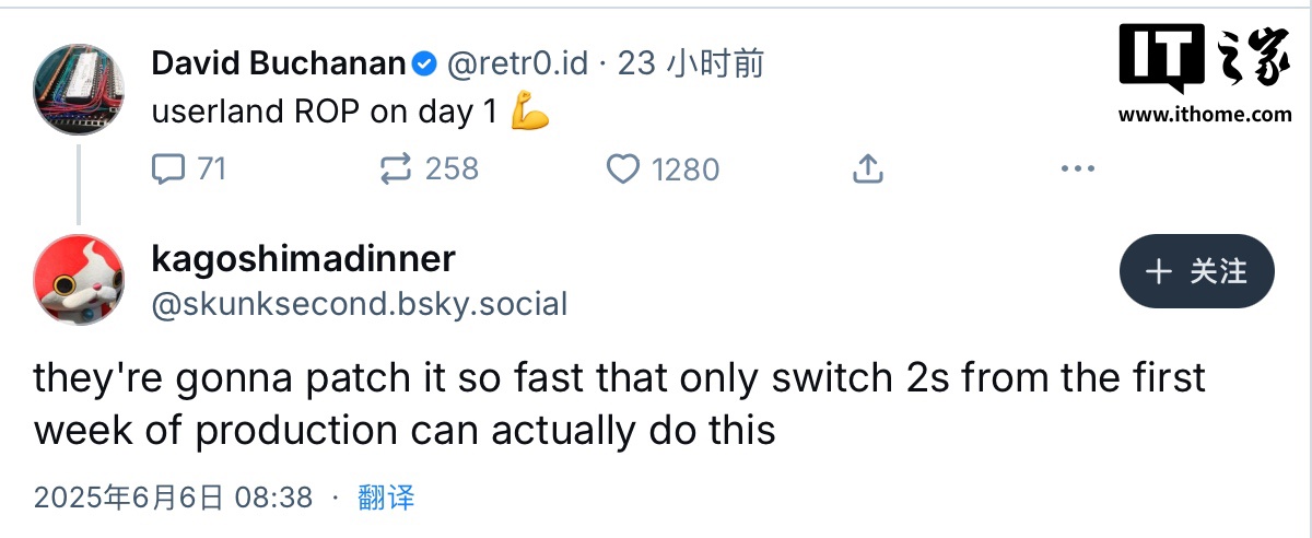 IT之家 6 月 6 日消息,开发者兼安全研究员 David Buchanan 昨日与社媒 BlueSky 发文,称其利用了任天堂 Switch 2 游戏机的 ROP 漏洞,运行了自定义图形。