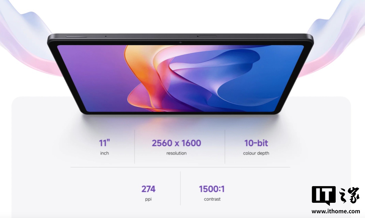 该平板搭载一块 11 英寸 IPS 屏幕,分辨率为 2560*1600,比例为 16:10,峰值亮度可达 600 尼特,支持 90Hz 高刷和 10bit 色深;内置四扬声器系统,支持杜比全景声。