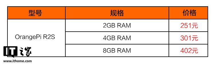 价格方面,OrangePi R2S 的 2GB 版本 251 元,4GB 版本 301 元,8GB 版本 402 元(不同平台价格可能会存在微小差异),IT之家附新品参数表: