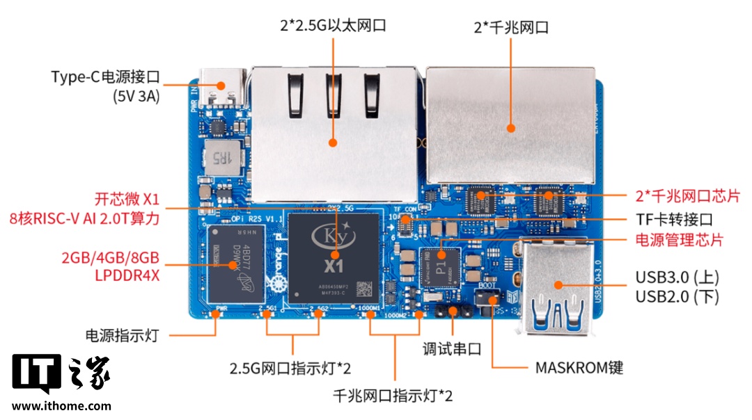 OrangePi R2S 采用了开芯微 Ky X1 8 核 RISC-V AI 处理器,提供 2TOPS CPU 融合的通用算力,拥有 2GB / 4GB / 8GB LPDDR4X 运行内存,支持 8GB eMMC 模块。