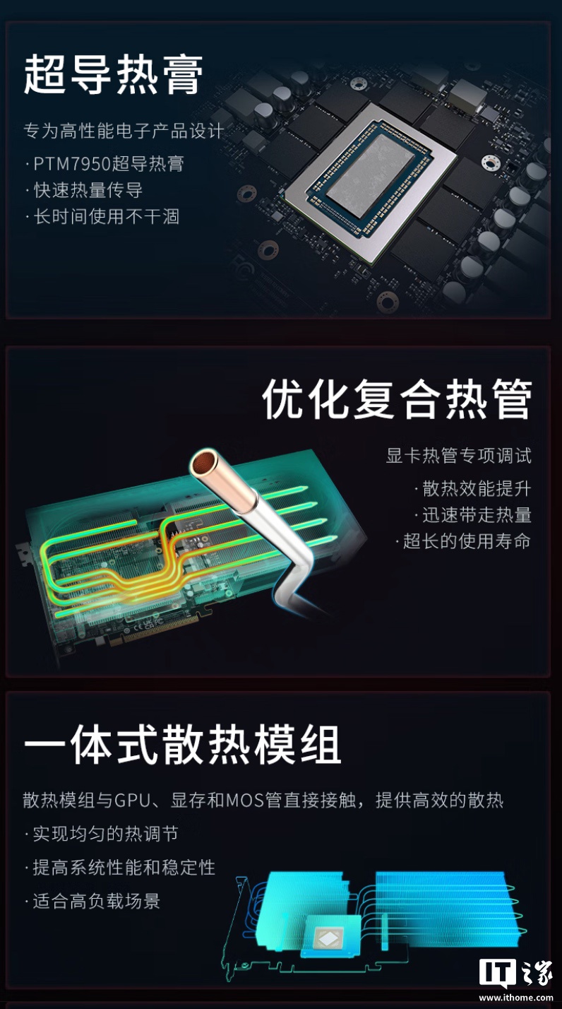 散热方面,该显卡采用复合式热管设计,可将热量扩散至整个散热模组,其 GPU 核心接触面采用霍尼韦尔 PTM7950 相变片,凭借其材料特性,可实现更高的导热效能,带来更长的寿命和更强的可靠性。