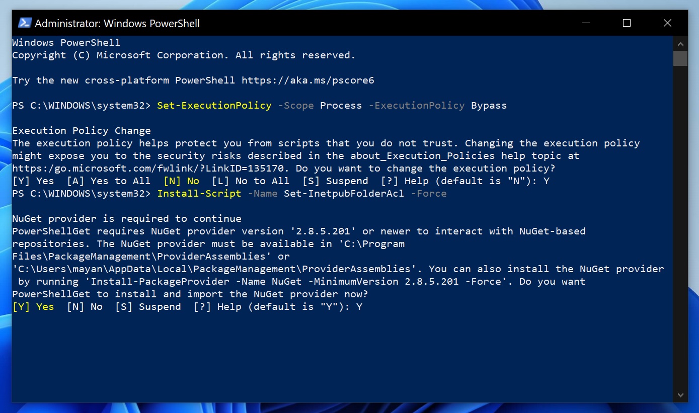 Set-ExecutionPolicy -Scope Process -ExecutionPolicy BypassInstall-Script -Name Set-InetpubFolderAcl -ForceSet-InetpubFolderAcl