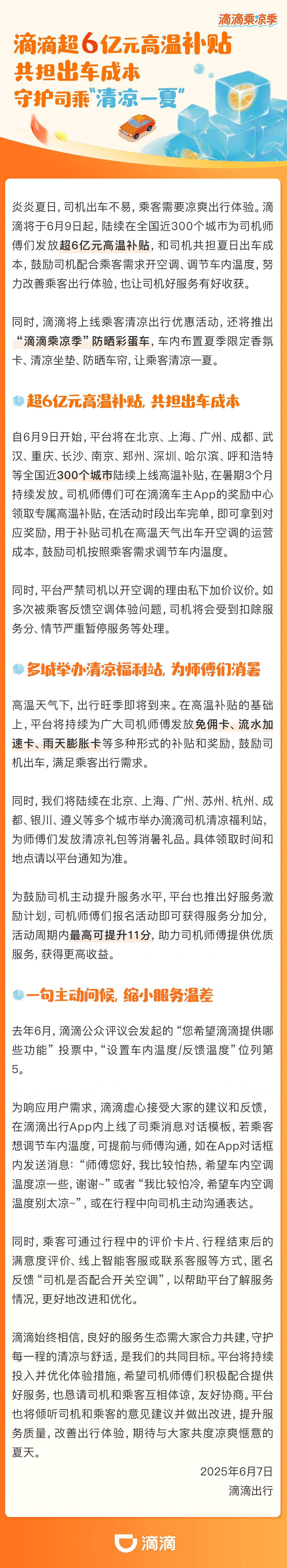 IT之家 6 月 7 日消息,滴滴宣布将从 5 月 9 日起陆续在全国近 300 个城市为司机发放“超 6 亿元”高温补贴,鼓励司机配合乘客需求开空调,改善乘客出行体验。