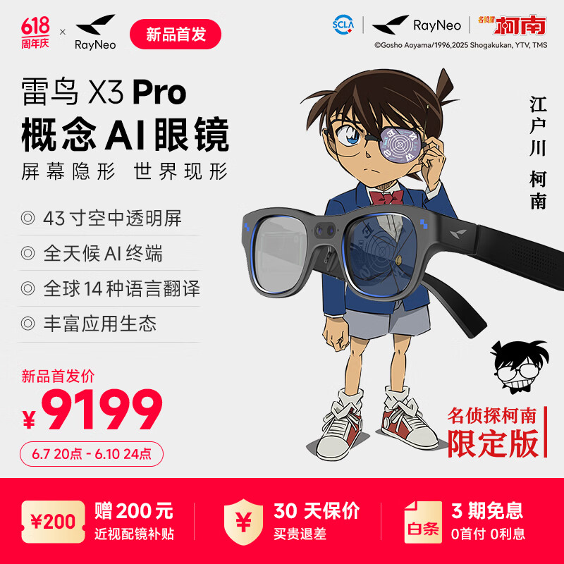 IT之家 6 月 8 日消息,雷鸟 X3 Pro 柯南限定版 AR 眼镜昨晚在京东平台开启预售,首发 9199 元。这款眼镜的原版定价 8999 元,柯南限定版贵了 200 元。