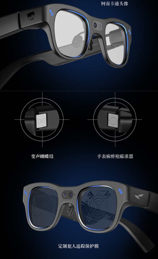 据介绍,这款眼镜以江户川柯南标志性头像与眼镜为设计灵感,镜腿、转轴处细节精心设计经典元素,包括柯南定制眼镜盒、变声蝴蝶结、手表麻醉枪瞄准器、定制犯人追踪保护膜、柯南定制眼镜盒等。