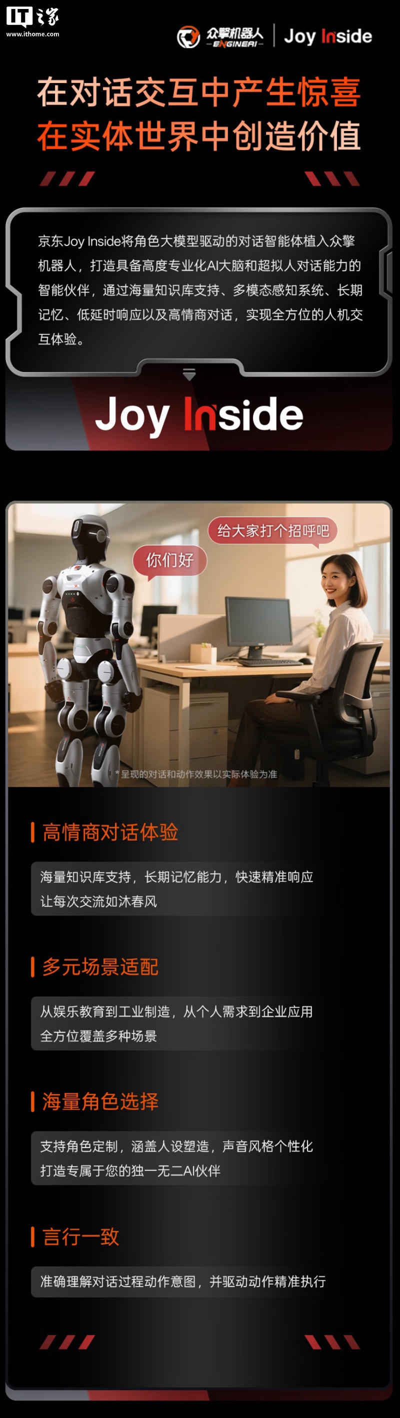 IT之家 6 月 9 日消息,众擎机器人宣布旗下轻量级、高动态、全开放人形机器人“众擎 PM01 京东 Joy Inside”在京东开售,定价为 18.8 万元。