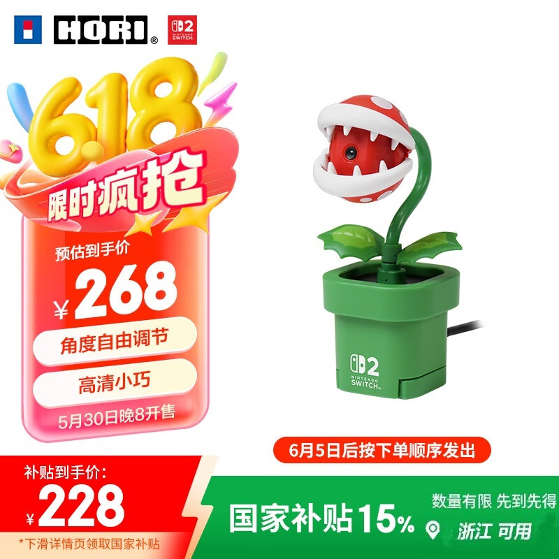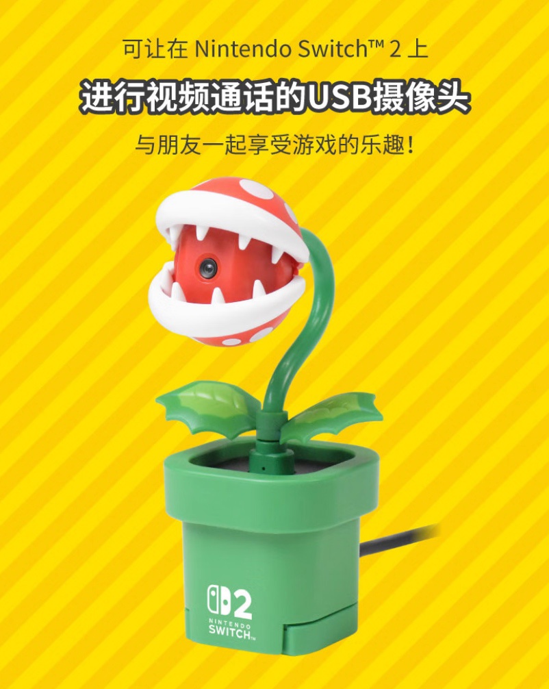 其中吞食花版本采用经典游戏《马力欧》中的“吞食花”角色造型,摄像头在“吞食花”的嘴部内,可以张开或闭合,闭合时可实现物理防窥;同时,该摄像头外设可实现花盆底座与摄像头本体分离,直接插入 Switch 2 的 USB-C 接口使用,方便掌机模式下进行视频聊天。