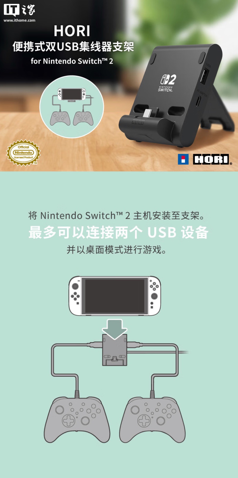 HORI 任天堂 Switch2 系列双 USB 集线器(拓展坞)支架