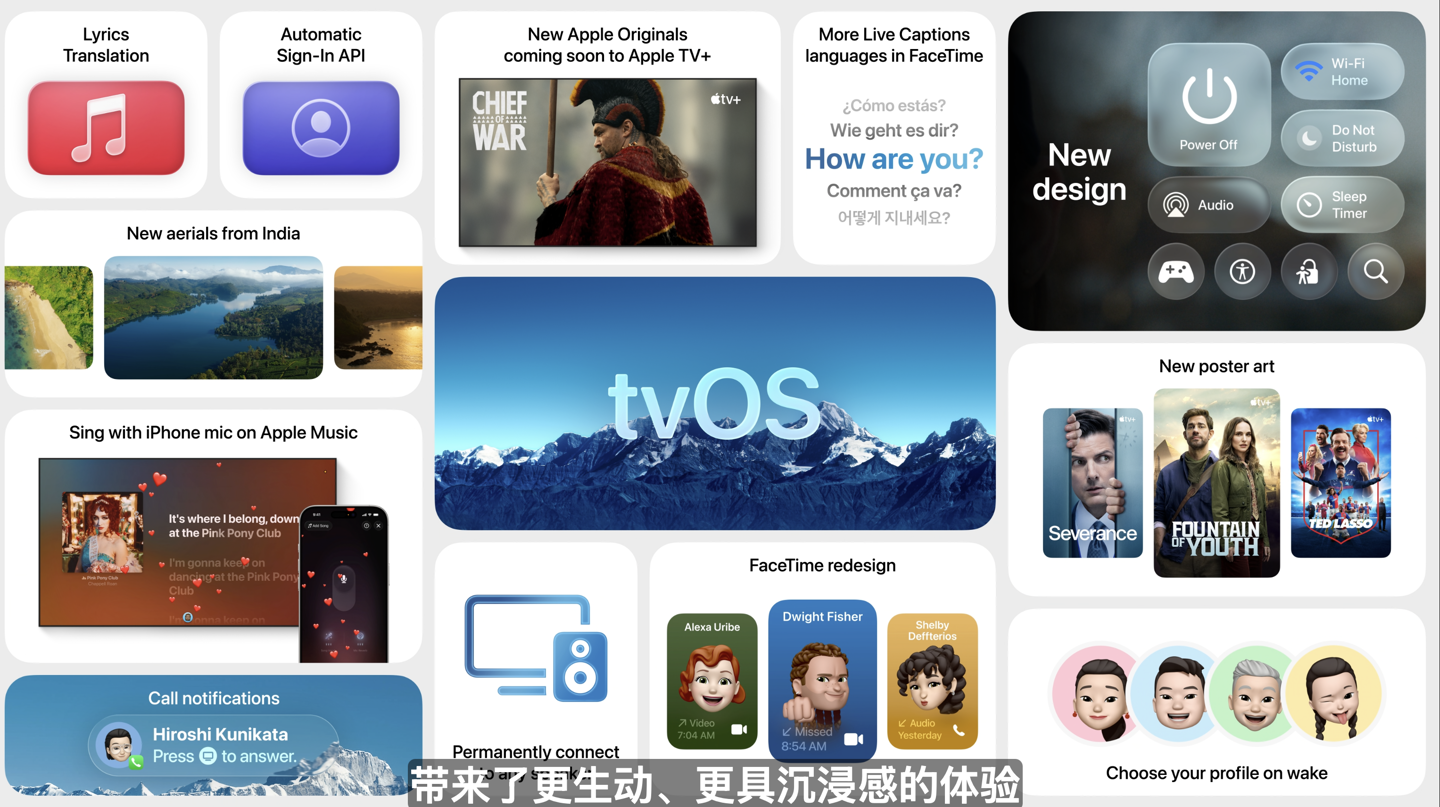 此外,tvOS 还改进了多用户登录功能,新增用户资料卡。改进 Apple Music 大屏电视下 UI 排版,同时支持视觉特效功能,用户可以使用 iPhone 控制在大屏上发送 Emoji 等内容应援。