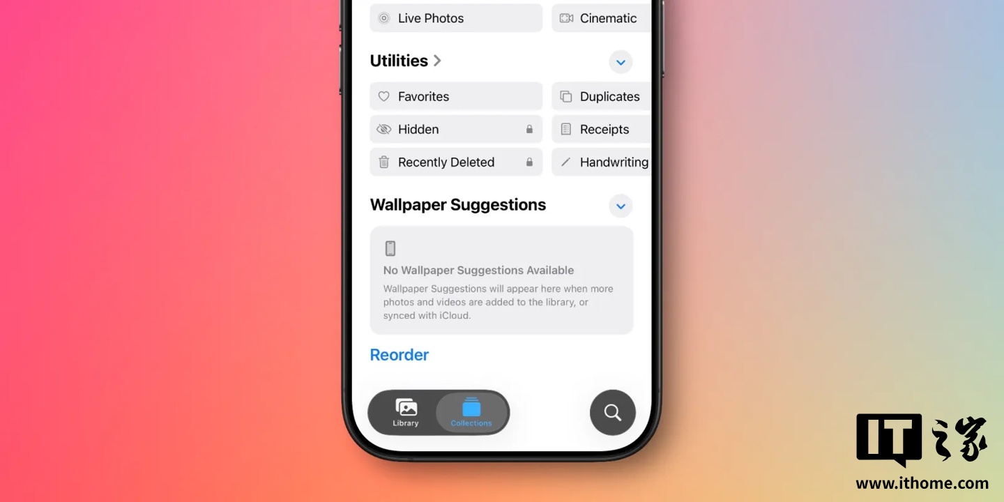 “Library”标签页展示了之前在 iOS 18 中位于屏幕顶部的照片浏览界面,而“Collections”标签页则包含了之前位于库下方的各种可自定义的分区。这种设计不仅让界面更加清晰,也恢复了用户熟悉的导航方式。