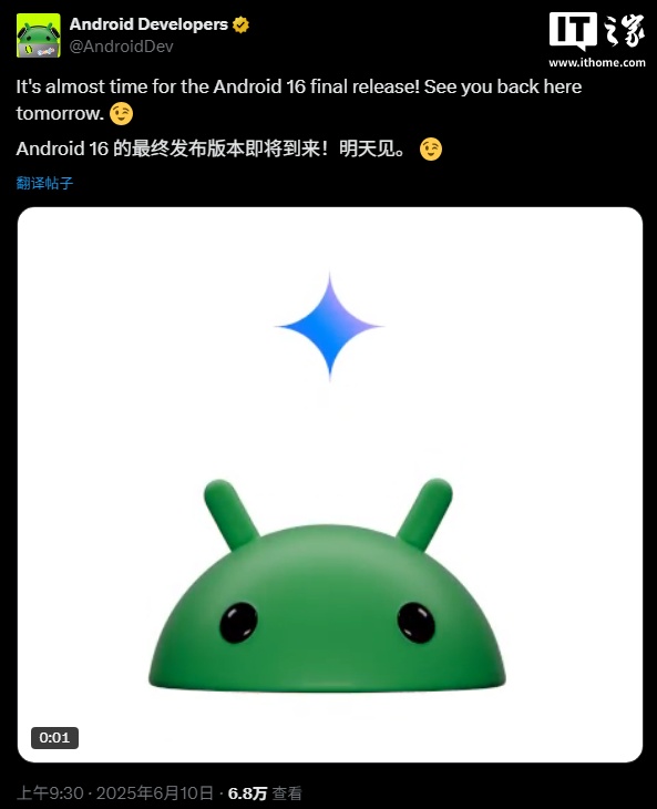 IT之家 6 月 10 日消息,安卓开发者官方 X 账号今日官宣,安卓 16 的最终发布版本即将到来,明天见。