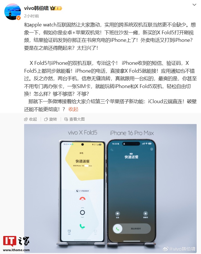 IT之家 6 月 10 日消息,vivo 通信科技有限公司产品经理韩伯啸今日发文宣布,vivo X Fold5 折叠屏新机将成为安卓第一个打通了 iCloud 云端直连的机型。