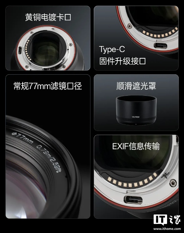 该镜头采用金属外壳、黄铜电镀卡口,采用 77mm 常规滤镜接口,配有 Type-C 固件升级接口。