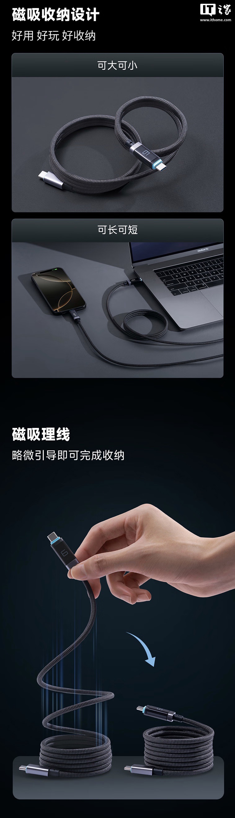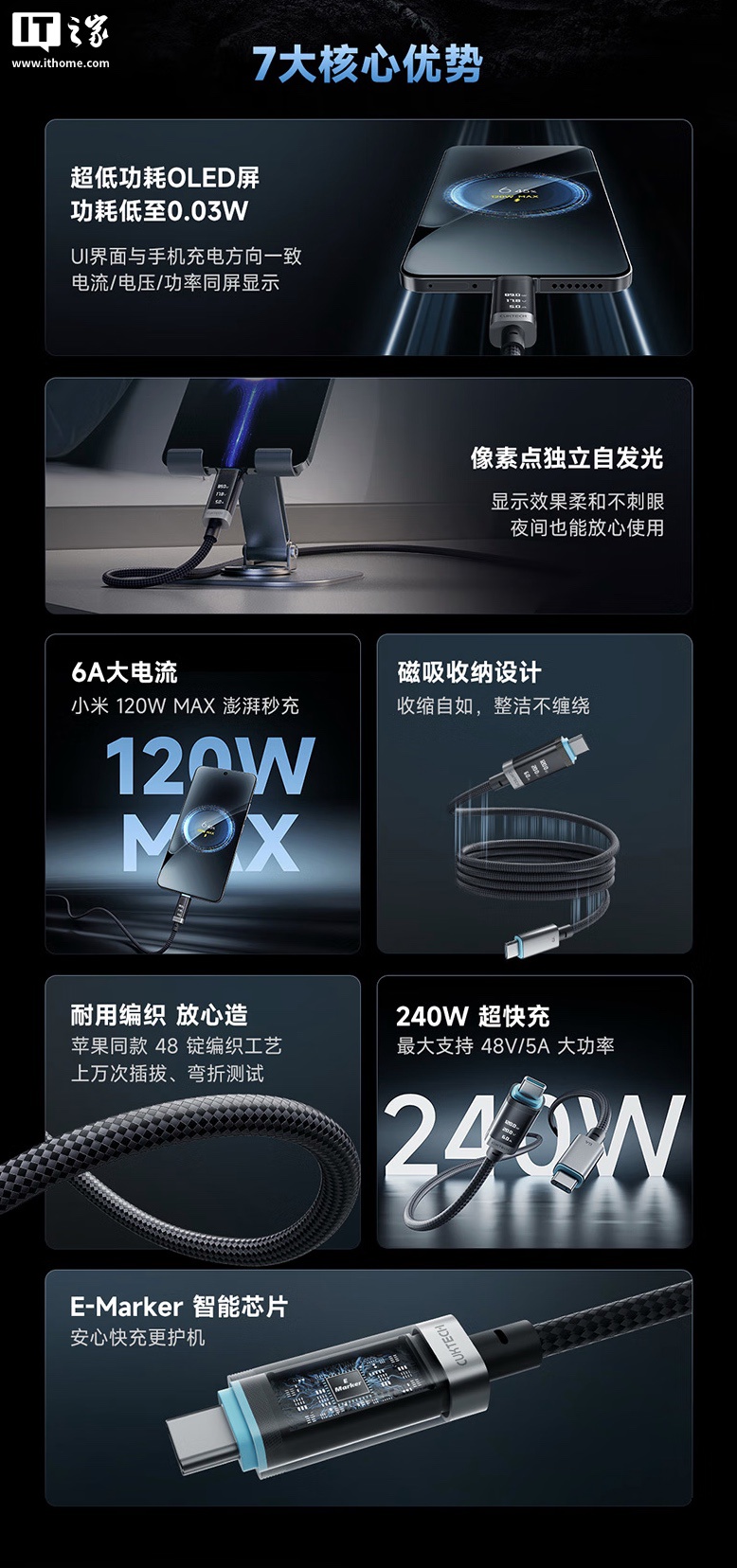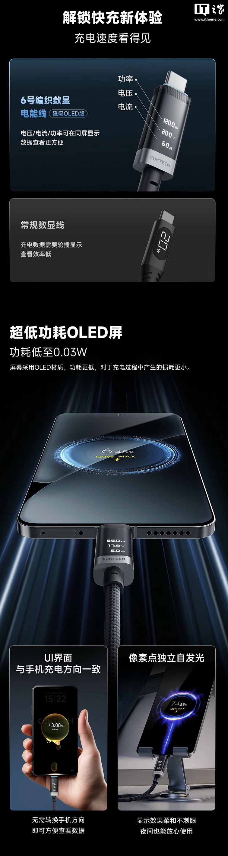 官方透露,这款充电线采用苹果同款 48 锭编织工艺,支持磁吸收纳,其配备低功耗 OLED 屏,号称功耗低至 0.03W,支持电流 / 电压 / 功率三项数据同屏显示。