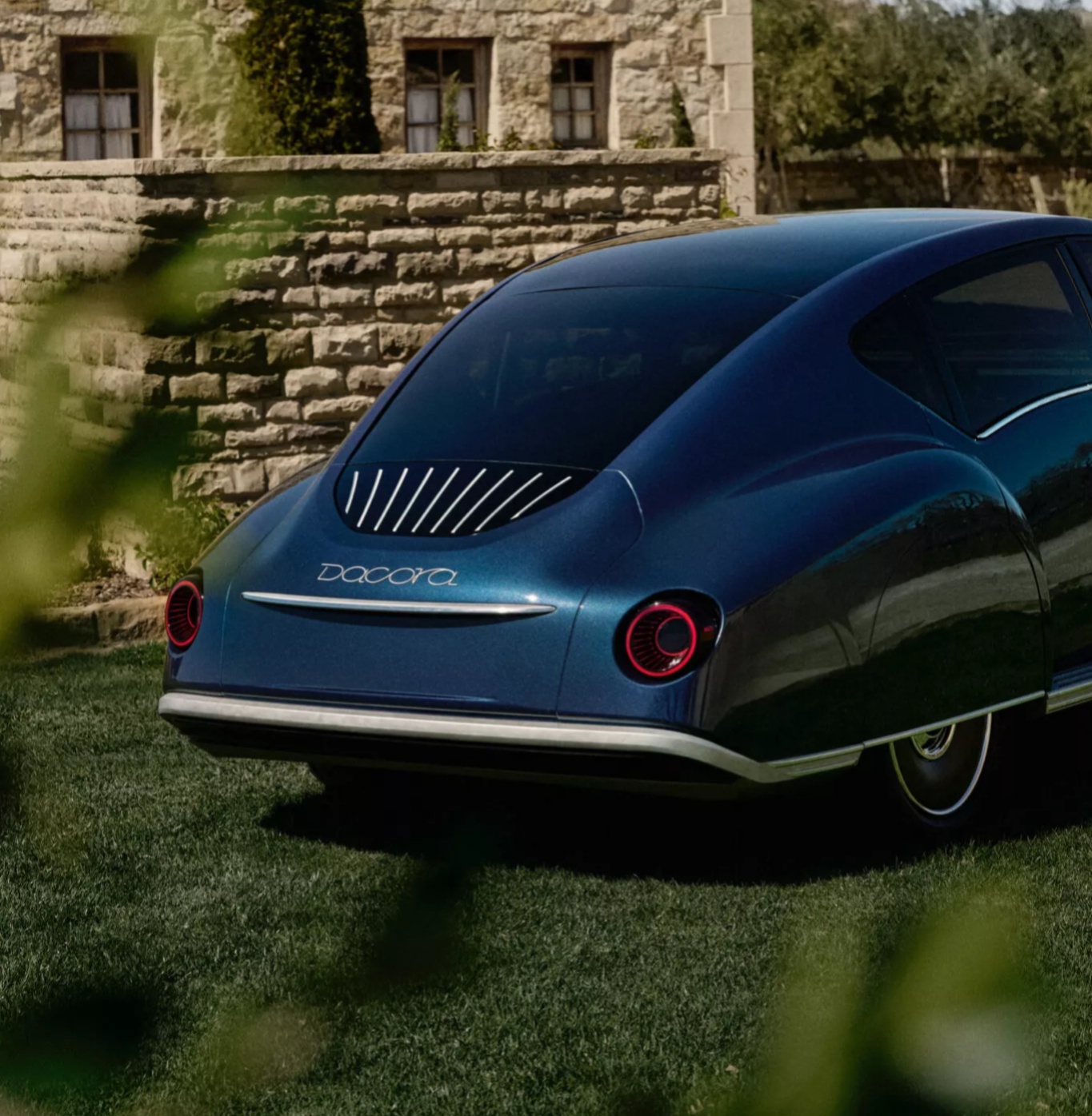 Dacora 表示,这款车的外观为公司与知名设计机构宾尼法利纳联合设计,设计灵感源自 1930 年代流线型现代主义风格。目前细节有限,但可见这款车拥有手工打造的木质引擎盖,左右搭配圆形大灯。