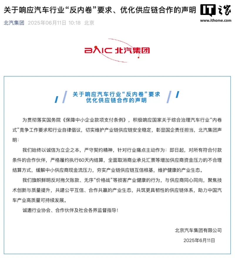 IT之家 6 月 11 日消息,北汽集团发布关于响应汽车行业“反内卷”要求、优化供应链合作的声明。北汽集团表示,为贯彻落实国务院《保障中小企业款项支付条例》,积极响应国家关于综合治理汽车行业“内卷式”竞争工作要求和行业自律倡议,切实维护产业链供应链安全稳定,彰显国企责任担当。
