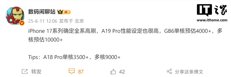IT之家 6 月 11 日消息,博主 @数码闲聊站 今天午间放出苹果 iPhone 17 系列的有关爆料:确定全系机型具备高刷新率。同步登场的 A19 Pro 也具有“很高”的性能设定,GB6 单核预估 4000+,多核预估 10000+。作为对照,A18 Pro 单核 3500+,多核 9000+。