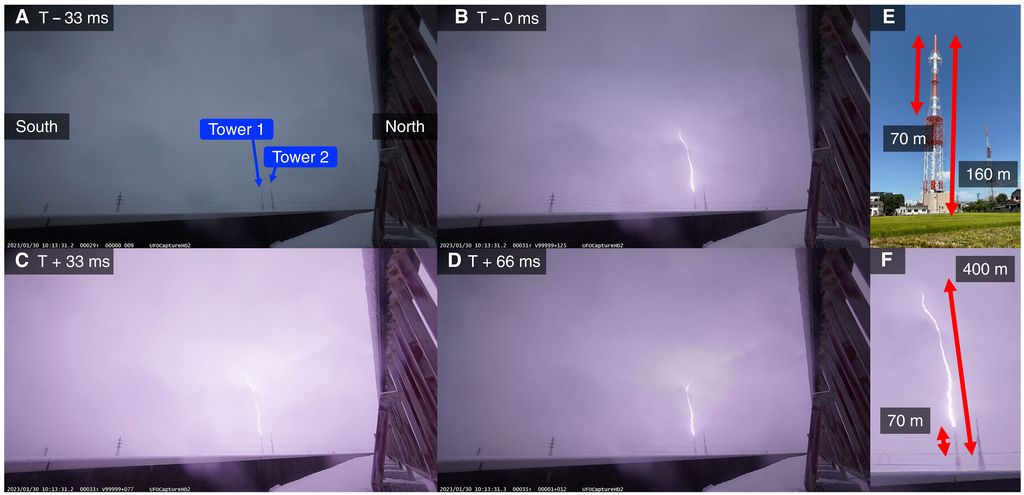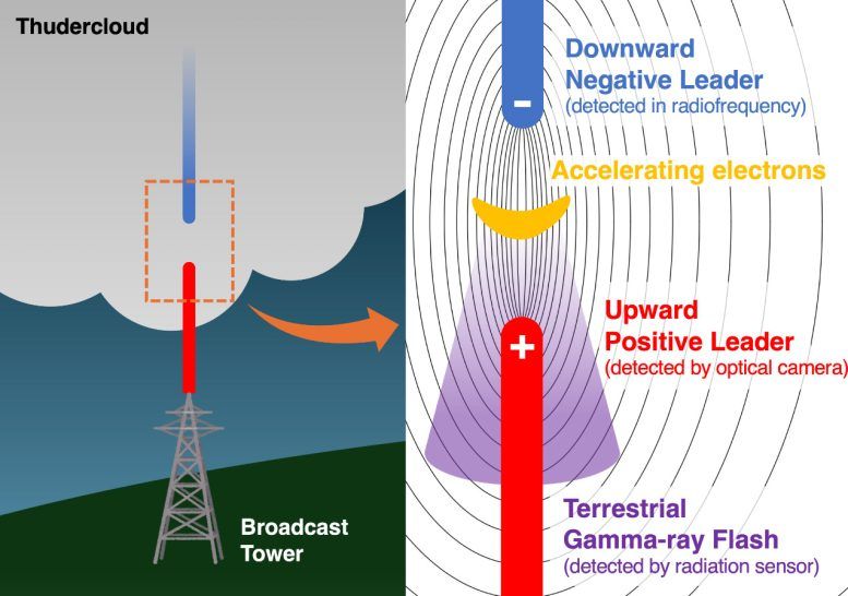 研究发现,两条闪电路径在碰撞时触发了 TGF。一条路径从雷云向下延伸至地面电视广播塔,另一条路径则向上发展。