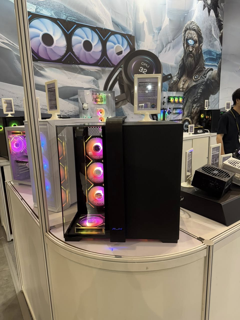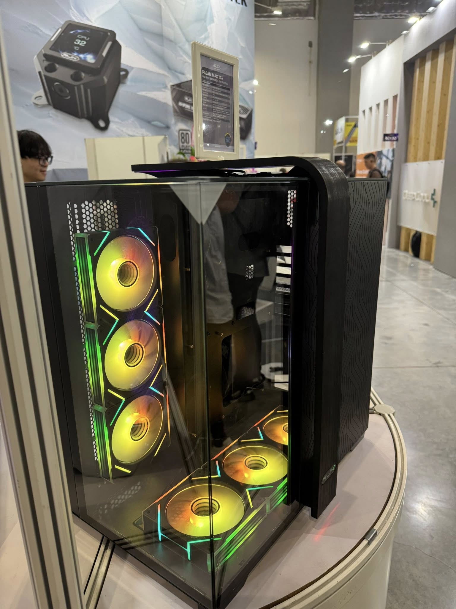 Raijintek 也展出了一些结构较为常规的机箱产品,包括曲面玻璃海景房 Atreus BT7、提供木质前板饰条选项的 Agos Ultra / Max MS4。