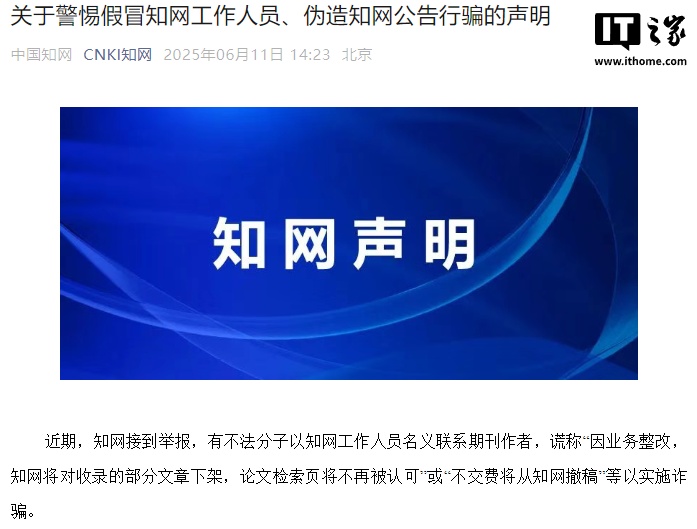 IT之家 6 月 11 日消息,中国知网今日发布《关于警惕假冒知网工作人员、伪造知网公告行骗的声明》,IT之家附原文如下: