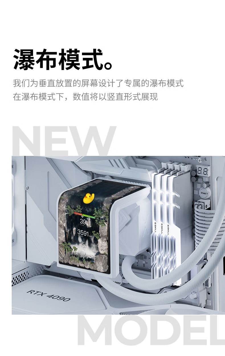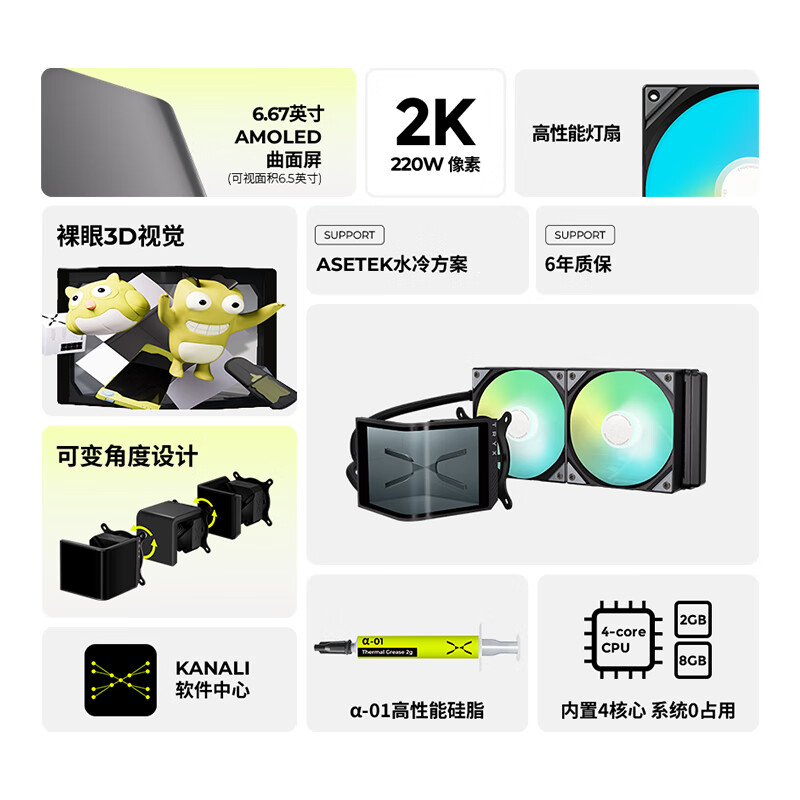 在显示效果上,这款冷头屏幕支持分屏、竖向瀑布模式,官方也会通过配套的 KANALI 软件持续更新裸眼 3D 素材库;此外显示模组自带嵌入式系统,拥有独立的 CPU 和存储,减少了对系统资源的占用。