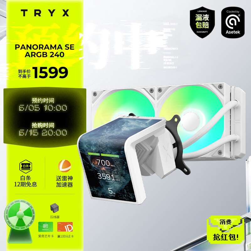 IT之家 6 月 11 日消息,TRYX 创氪星系去年推出了展域 PANORAMA SE ARGB 360 曲面屏一体式水冷散热器。如今该系列的 240 版本也已上架,预约价 1599 元;同系列 360 版本当下的到手价则是 1699 元。