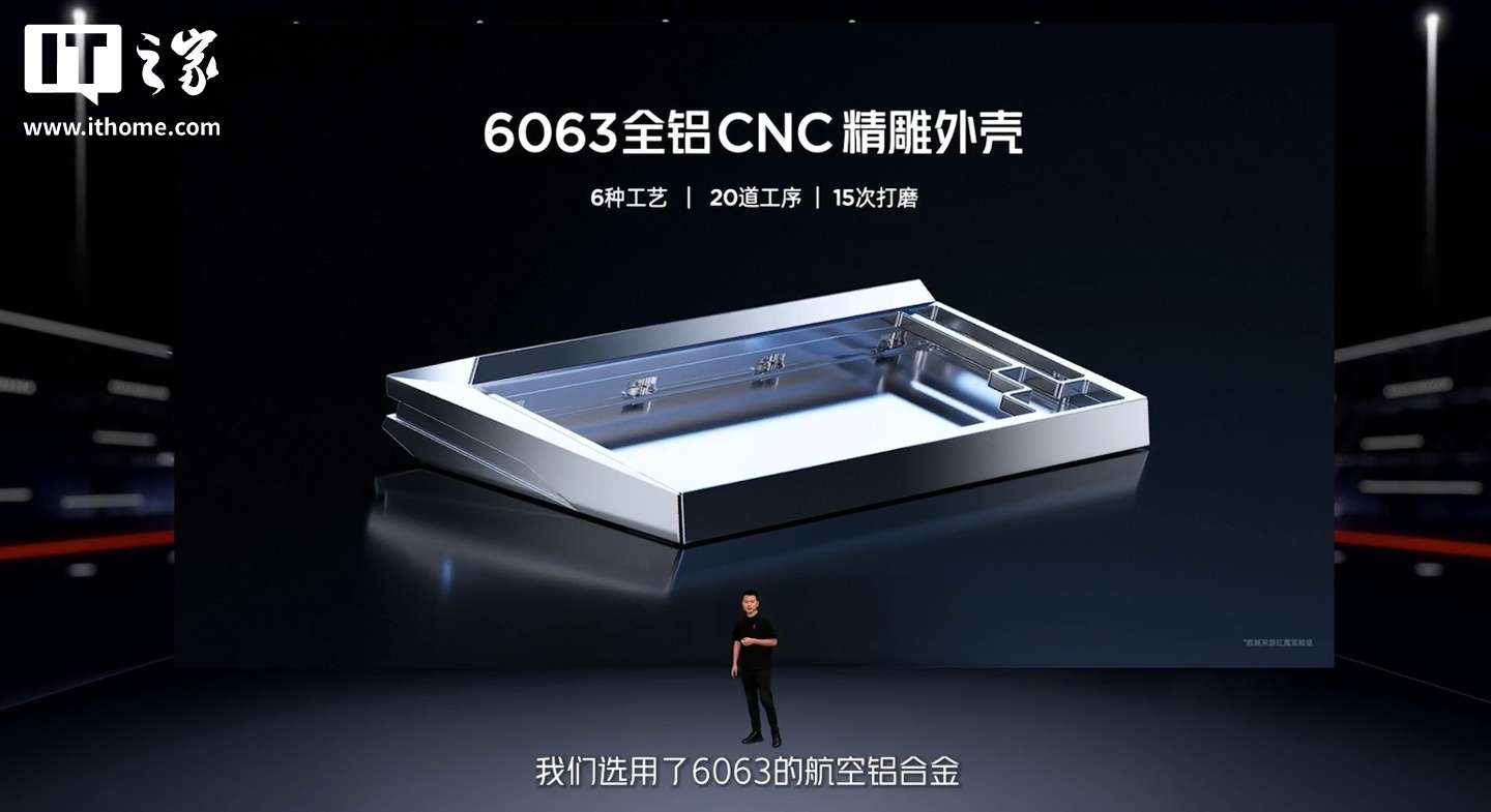 据介绍,红魔首款客制化磁轴键盘采用直线棱面切割设计,使用 6063 全铝 CNC 精雕外壳(6 种工艺、20 道工序、15 次打磨)。