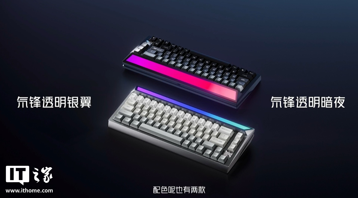 红魔新款键盘提供氘锋透明银翼和氘锋透明暗夜两款配色,支持 MAGIC SPEED TURBO 魔速连接技术,提供红魔蝶翼磁轴(自研十字蝶翼结构)。