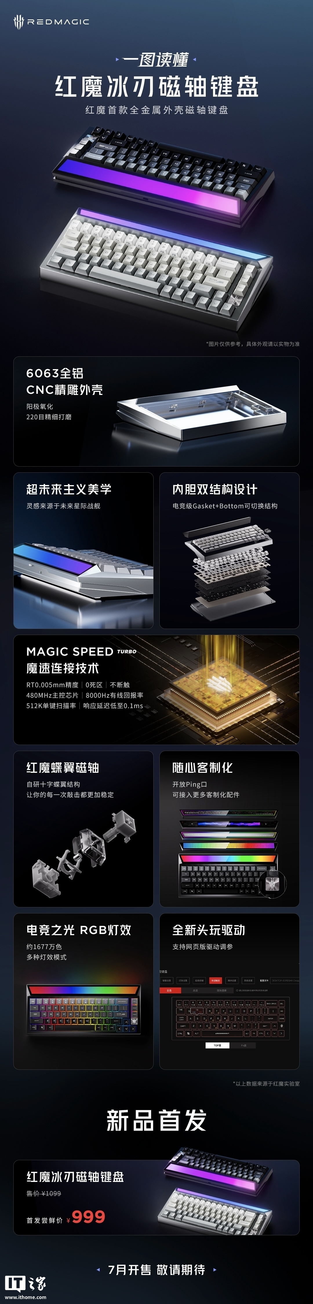 IT之家 6 月 11 日消息,在今天的红魔电竞平板 3 Pro 暨红魔电竞宇宙新品发布会上,红魔首款客制化磁轴键盘 —— 冰刃磁轴键盘正式发布,定价 1099 元、首发 999 元(预计 7 月开售)。