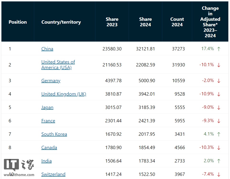 其他位居前六的国家仍然是美国、德国、英国、日本和法国。韩国总体排名升至第七,加拿大现居第八,印度、瑞士位居第九、第十。