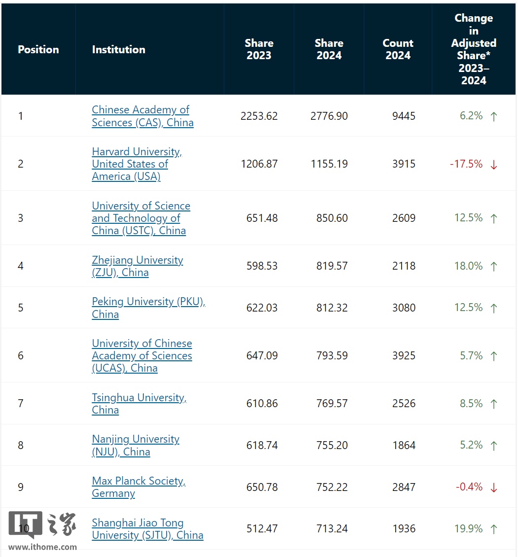 IT之家注:自然指数科研领导者榜单每年基于上一年的数据发布一次,属于自然指数数据库的一部分。该数据库追踪的是对于发表在 145 种高质量自然科学和健康科学期刊上的科研论文的贡献情况。