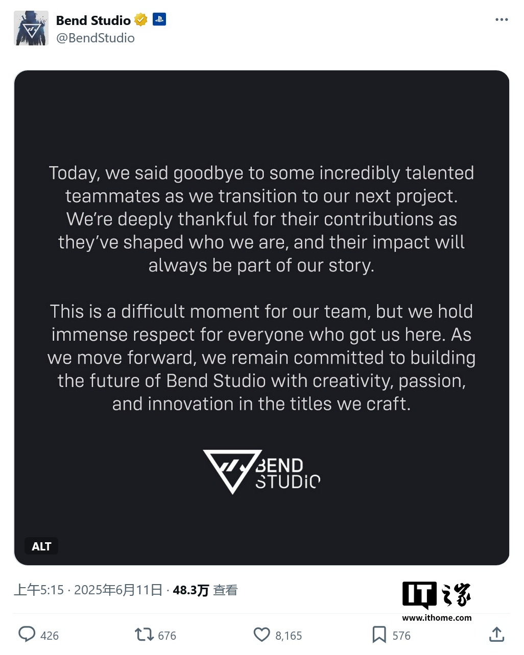 IT之家 6 月 11 日消息,索尼旗下第一方工作室 Bend Studio 今天(6 月 11 日)通过 X 平台发布公告,宣布由于工作室正过渡到下一个项目,不得不与一些“才华横溢的团队成员”告别。