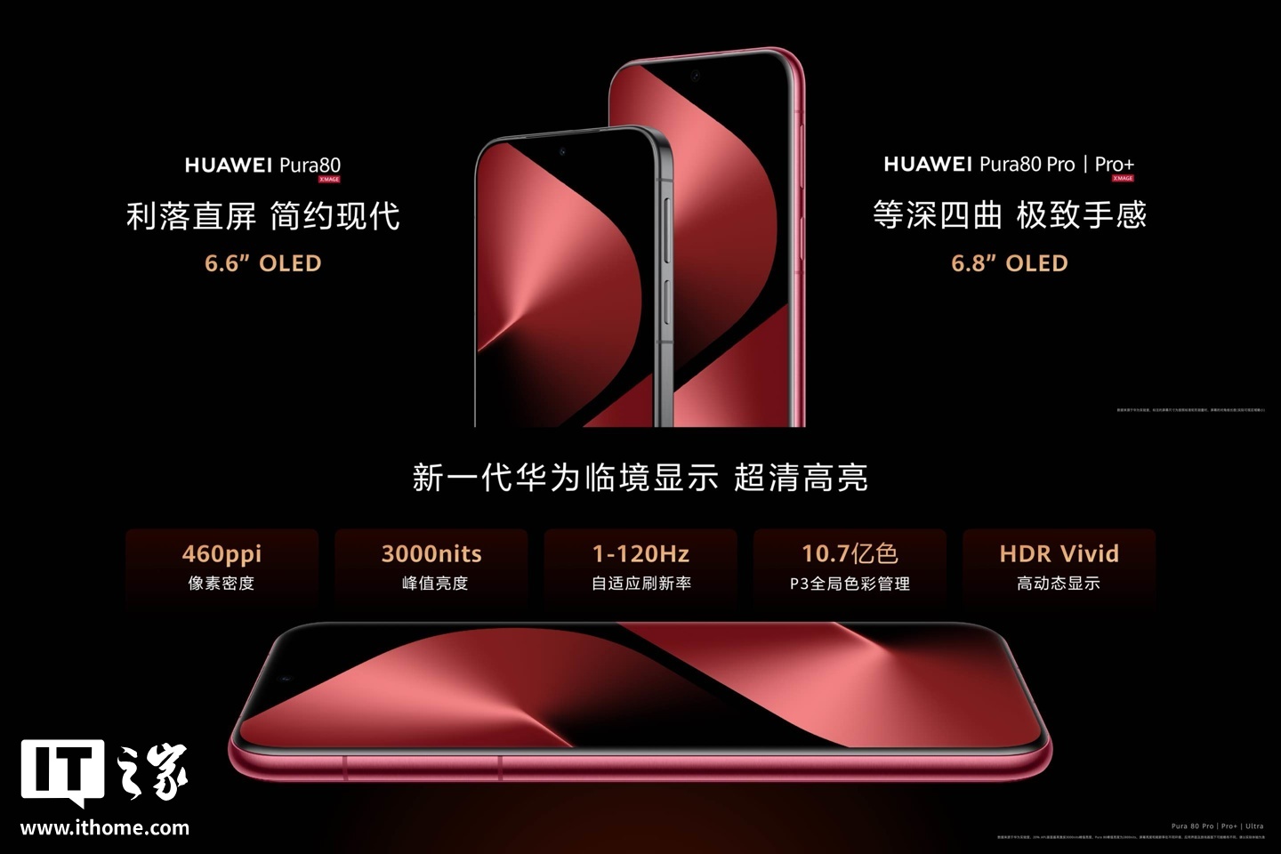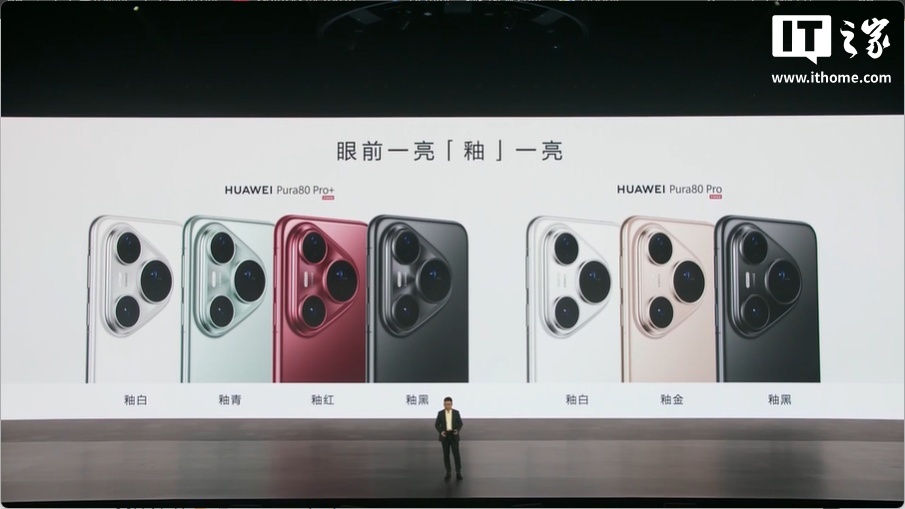 IT之家注意到,外观方面,Pura80 系列采用耀目风向标家族化家族语言、织纹中框,共有两种屏幕形态,Pura80 为 6.6 英寸直屏,Pro、Pro + 为 6.8 英寸等深四曲面,局部峰值亮度 3000nit,支持 1-120Hz 自适应刷新率。设计语言上,此次新品设计灵感源自中国传统单色釉瓷器,以纯色自然美学理念,打造出如釉般温润纯粹的独特质感。余承东更玩了一把谐音梗:让人眼前一亮“釉”一亮。