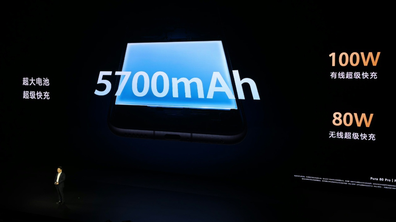 华为 Pura80 Pro 系列及 Ultra 内置 5700mAh 电池,支持 100W 有线超级快充、80W 无线超级快充。
