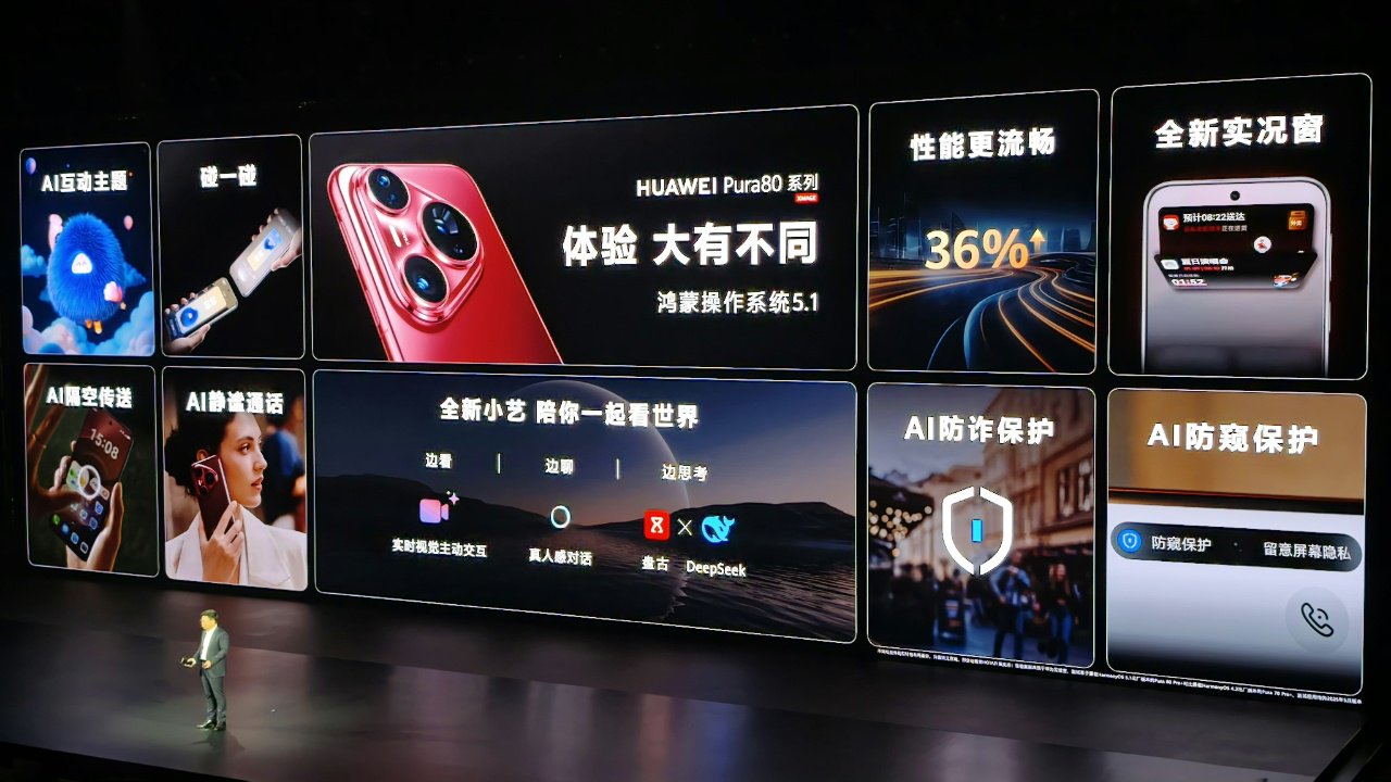 华为 Pura80 系列首发搭载鸿蒙操作系统 5.1,整机性能提升 36%。全新小艺再升级,化身用户的专属穿搭造型师、随身导游、生活专家等,能够随时随地陪用户看世界,还能成为 AI 实时视觉无障碍交互,语音指引陪伴盲人用户。