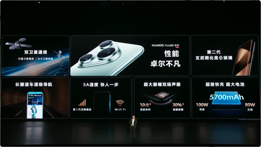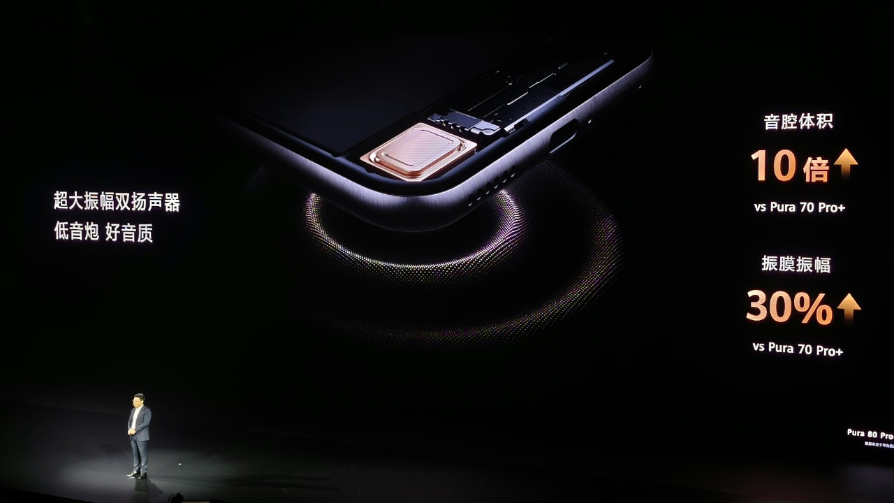 华为 Pura80 系列搭载超大振幅双扬声器,相较 Pura 70 Pro + 音腔体积提升 10 倍,振膜振幅提升 30%。