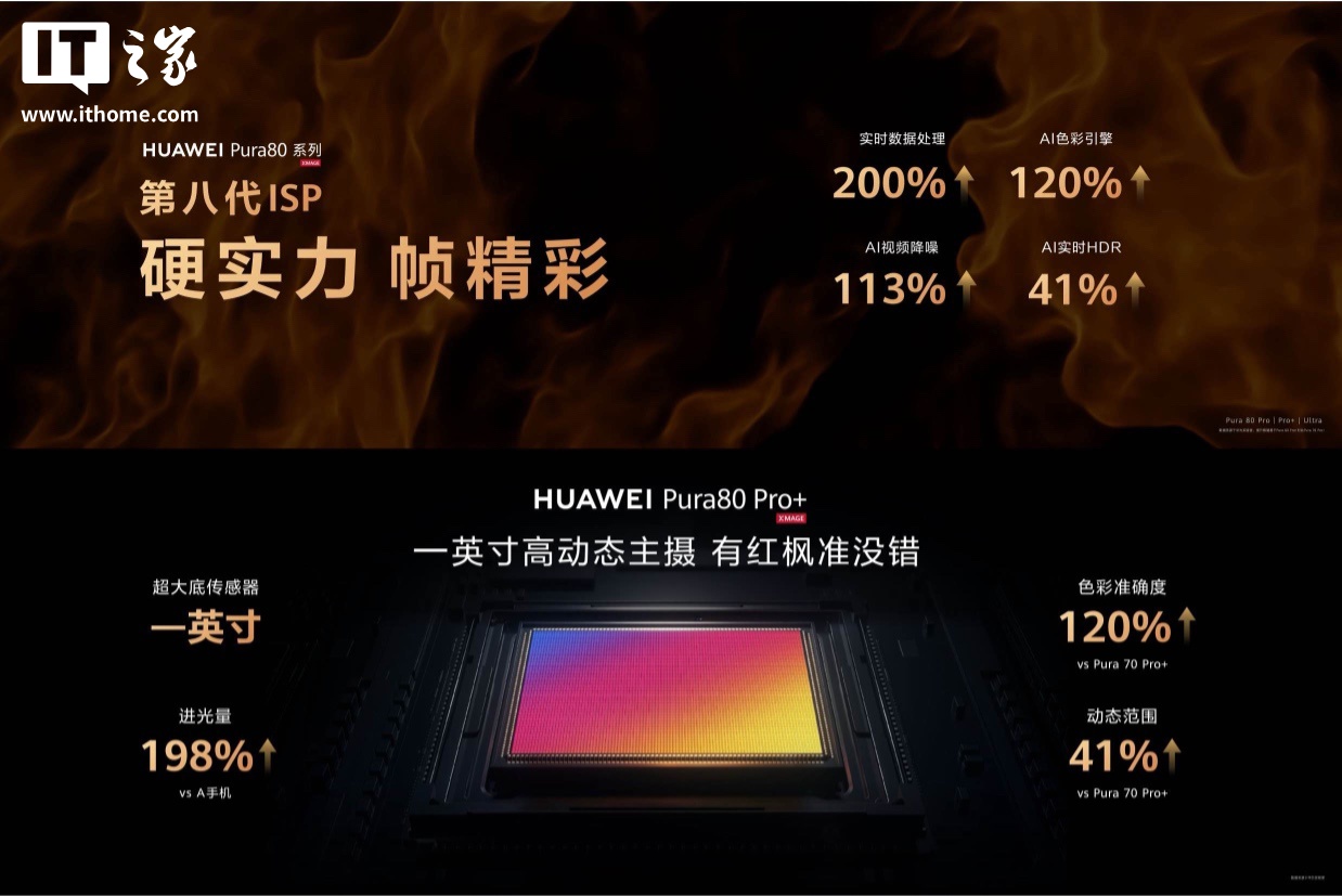 华为 Pura80 Ultra 相比 Pura80 Pro + 则搭载了一英寸超高动态范围主摄,拥有业界最高动态范围和业界最大进光量,采用 TCG 三重实时融合技术,超亮不过曝,暗部有细节。华为 Pura80 Ultra 还业界首创一镜双目超大底双长焦,通过一镜双目的双焦段切换式长焦结构,将 3.7x 中长焦镜头与 9.4x 超长焦镜头合二为一,配合 1/1.28 英寸 50MP RYYB 行业最大长焦传感器,实现长焦画质全面飞跃。业界首创超精密双光路切换机构,140 + 精密配件紧密配合,通过 18 万次可靠性测试。在拍摄舞台场景、高倍率场景、长焦人像等场景下,具有超强细节还原能力。