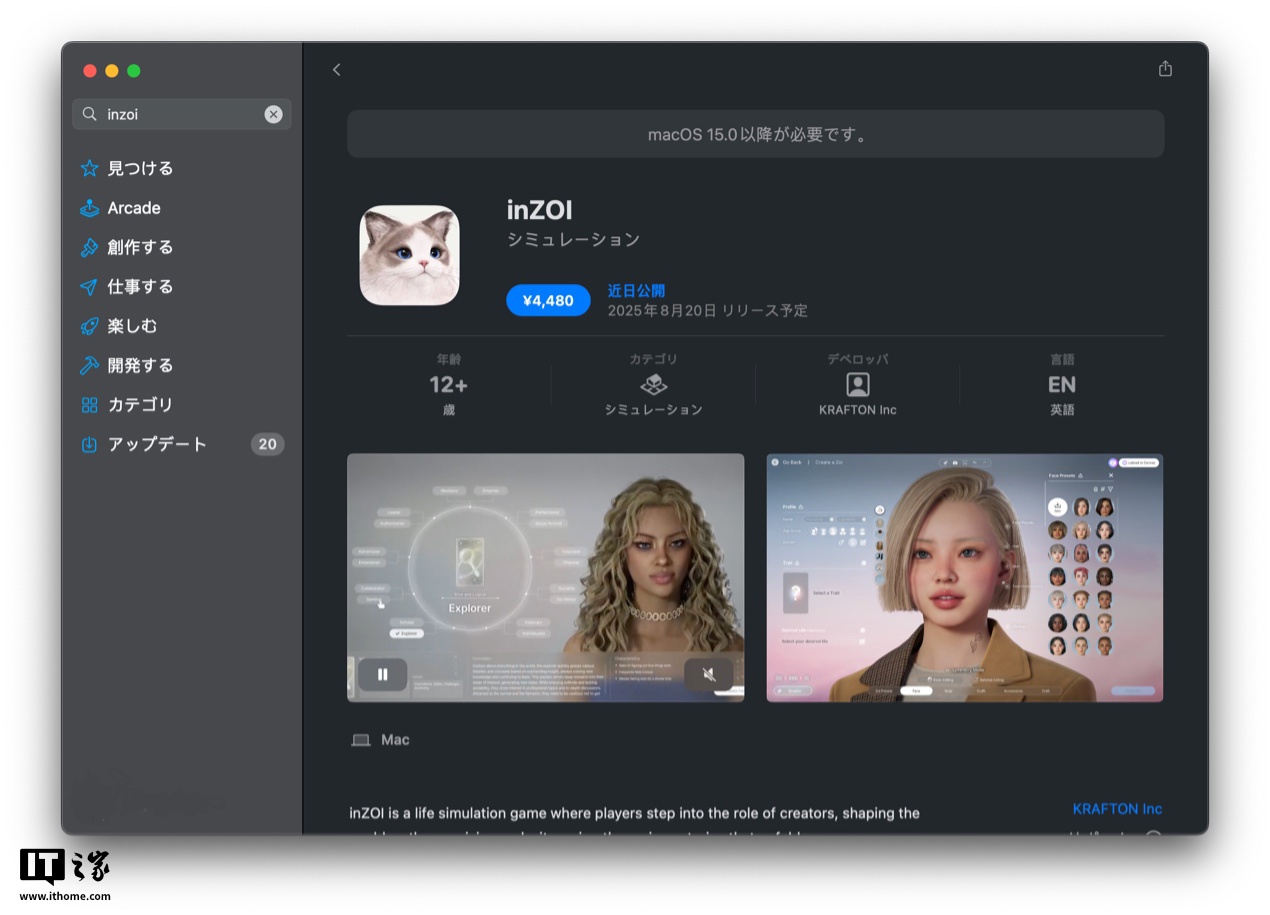 同时,根据IT之家此前报道,《inZOI 云族裔》也将登陆 macOS 平台,该游戏将于 8 月正式上线 Mac App Store,目前已开放预购,预购价格 4480 日元(IT之家注:现汇率约合 222 元人民币)。